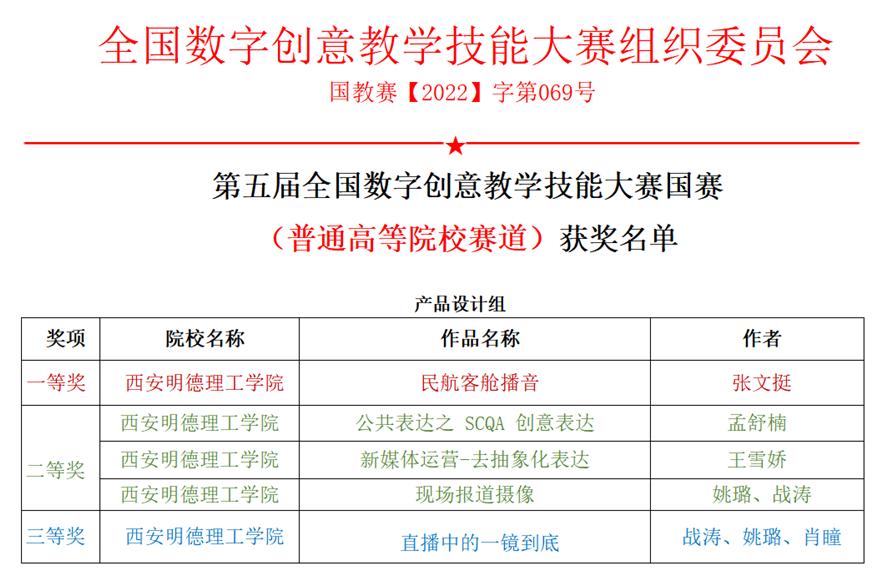 近日,第五届全国数字创意教学技能大赛获奖名单揭晓,LETOU官网艺术与设计学院播音与主持艺术专业多名教师在此次大赛中获得一等奖1项,二等奖3项,三等奖1项的佳绩。