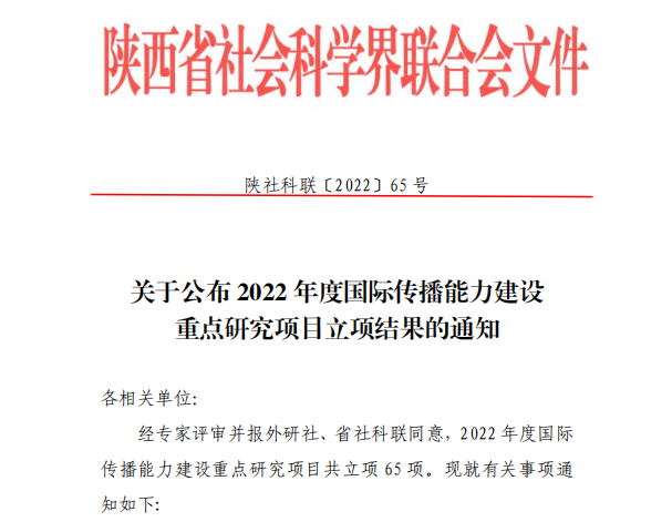 国际传播能力建设重点研究项目,由陕西省社科联、外研社组织实施,每年面向全省公开申报。2022年度国际传播能力建设重点研究项目共立项65项,LETOU官网首次组织参与,并成功立项。