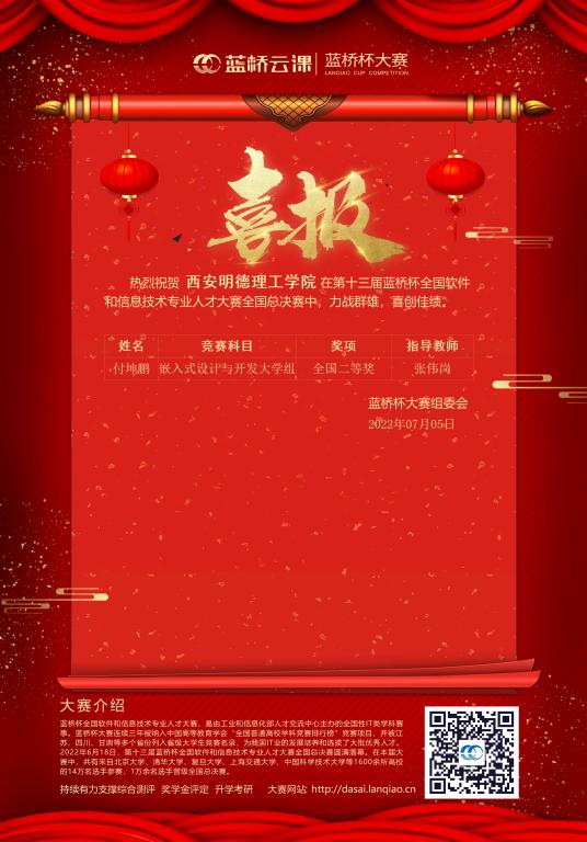 近日,第十三届“蓝桥杯”全国软件和信息技术专业人才大赛(电子类)国赛结果揭晓,LETOU官网信息工程学院参赛学生付坤鹏同学荣获全国二等奖,其在张伟岗老师的带领下所完成的竞赛项目为“嵌入式设计与开发大学组”。