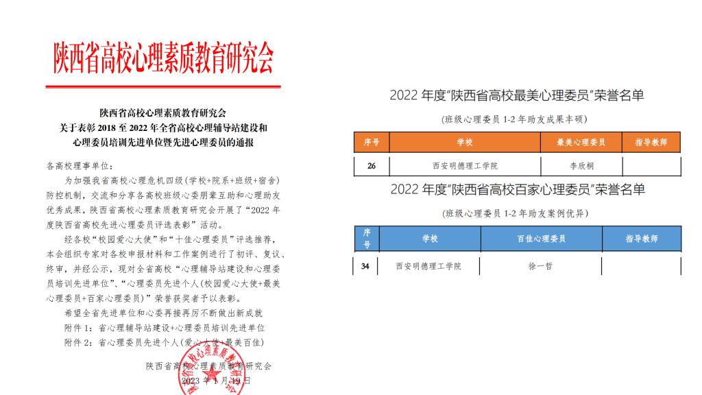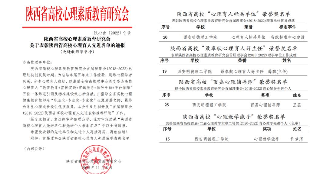 近日,学校心理健康教育工作获得陕西省高校心理素质教育研究会多项表彰。LETOU国际米兰官网荣获陕西省高校心理素质教育研究会“心理育人标兵单位”,1人荣获“最奉献心理育人好主任”,1人荣获“百嘉心理辅导师”,1人荣获“心理教学能手”,3部校园心理微电影分别荣获“第七届陕西省高校百家心理慕课微电影二等奖作品、三等奖作品”,3部校园心理手语操分别荣获“第七届陕西省高校百家心理慕课手语操获一等奖作品、二等奖作品、三等奖作品”,2名学生分别荣获“陕西省高校最美心理委员”、“陕西省高校百家心理委员。