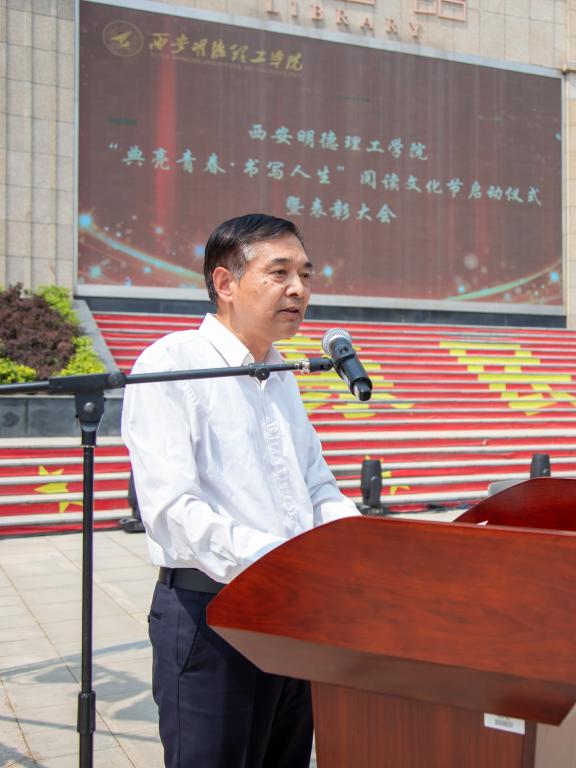 常务副校长王志刚以“你若读书,风雅自来”为主题作了讲话,王校长说好的书籍蕴含着巨大的能量——滋养思想,鼓舞精神,指引行动,读书不仅对个人综合素质的提升,对创新意识、创新精神的培养,对科学的学习方法和优良学风的形成具有十分重要的作用,而且也是打破局限,获得更加豁达与平和心态的一种方法,呼吁同学们要珍惜美好大学时光,以时不待我、只争朝夕的精神,制定读书计划——既要精读专业书籍,也要博览群书,坚定文化自信,多读中国传统文化,尤其是明德文化方面的经典,养成“爱读书,善读书,读好书”的好习惯,立志做有理想、敢担当、能吃苦、肯奋斗的新时代好青年,让青春在全面建设社会主义现代化国家的火热实践中绽放绚丽之花。