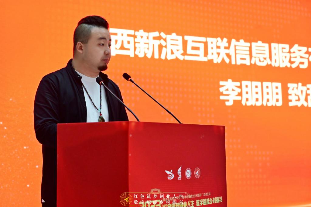 陕西新浪互联信息服务有限公司副总经理李朋朋致辞,他希望借助新浪陕西的媒体平台,为广大青年学生搭建一个展示自己才华和智慧的舞台,可以能够激发出更多大学生们的创新思维和创业激情,进一步推动数字电商助力乡村振兴。