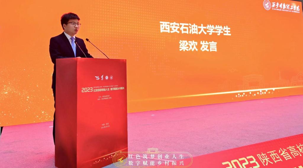 西安石油大学学生梁欢作为学生代表发言,他分享了西安石油大学油创小分队在中国国际互联网+创新创业大赛、挑战杯等创新创业活动中取得的优异的成绩。并表示作为新时代的大学生,有责任为乡村振兴、为全面建设社会主义现代化强国贡献青春力量!