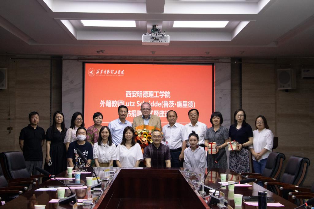 为了表达学校对外籍教师Lutz Schridde(鲁茨•施里德)先生从教数十载的贡献及捐赠行为的衷心感谢与崇高敬意,6月14日下午,学校在图书馆407会议室隆重举行外籍教师Lutz Schridde(鲁茨•施里德)图书捐赠仪式暨座谈会。会议由图书馆(档案、校史馆)馆长王爱霞主持,常务副校长王志刚、人力资源处处长白秦川、国际教育学院院长兼外事办公室主任于艳英、语言文化传播学院院长马庆林、德语专业负责人王勇、德语专业专职教师张露、陈婧、刘无双、张阳及外事办公室、图书馆等相关老师20余人参加了座谈会。
