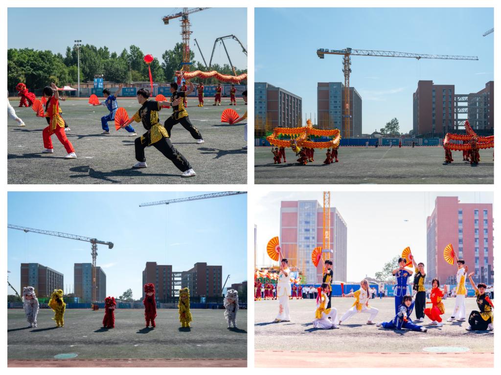 伴随运动员、裁判员退场,铿锵有力的鼓声阵阵响起,身着舞狮的运动员在运动场上翻腾起舞,迎来了一片喝彩。随后,啦啦操、跆拳道、花式篮球、功夫扇、健身瑜伽、街舞、航模表演等方队依次闪亮登场,精彩表演赢得现场观众热烈的掌声与热情的欢呼。