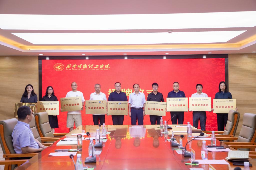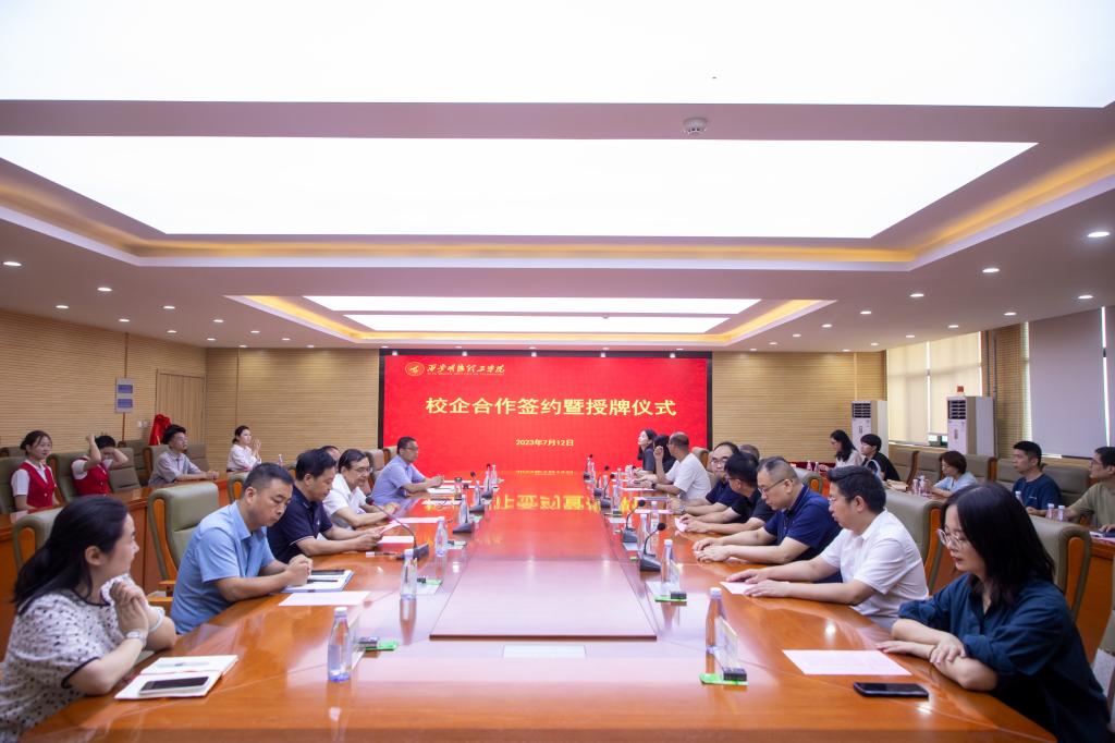 企业代表发言结束后,校长杨健君与各企业代表共同签署校企合作框架协议,常务副校长王志刚与各企业代表互相授牌,在合影留念后,本次仪式圆满结束。之后,各位企业代表参观了校史馆、图书馆、教学成果展、专业实验室等校园设施环境。