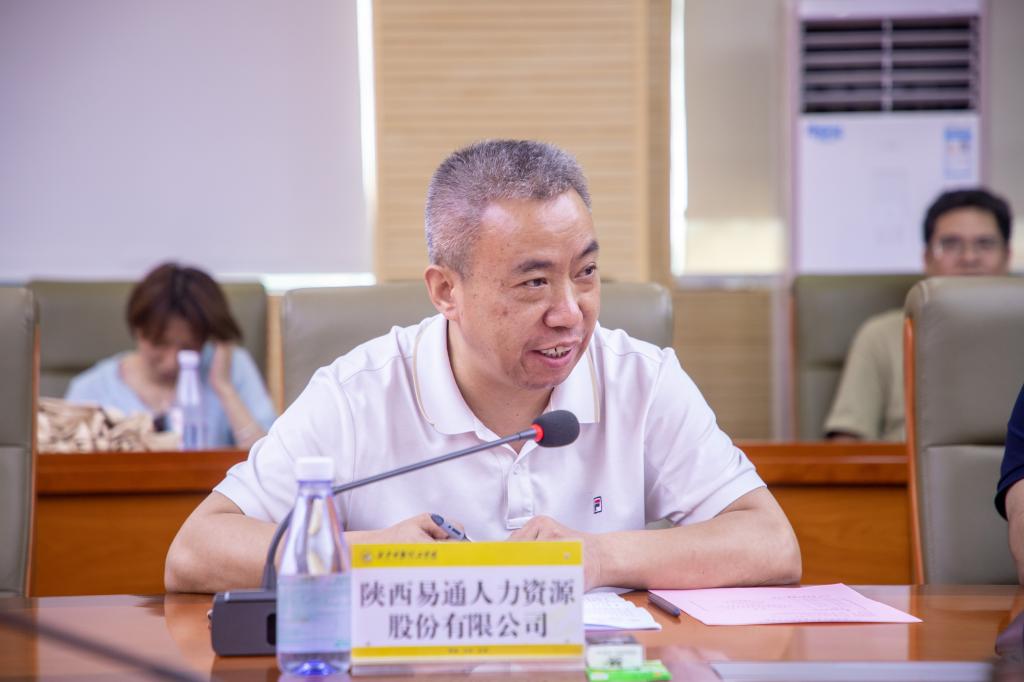 随后,陕西新航科训航空有限公司董事长吴光焱、陕西易通人力资源股份有限公司总经理刘晓平、华天科技(西安)股份有限公司人力资源部部长李大树作为企业代表进行发言。各位企业代表向此次集体签约暨授牌仪式的举办表示热烈祝贺,同时也希望在今后的合作中,进一步探索信息、人才、技术与资源共享机制,以促进校企双方达成更加深入,更具有实效性的高质量合作。
