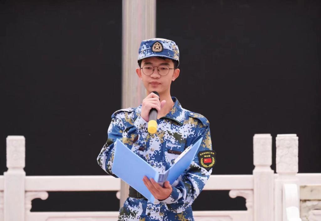 新生代表黑佳浩同学发言,他表示作为明德新生,面对新的起点,定会牢记校训,以全新面貌,做到明确目标,勤学善思;学以致用,开拓创新;脚踏实地,努力奋斗。在军训中戒骄戒躁,以军人标准要求自己,牢守纪律意识,培养坚毅品质、顽强意志和互助精神,并呼吁同学们以奋进姿态迎接人生新征程。