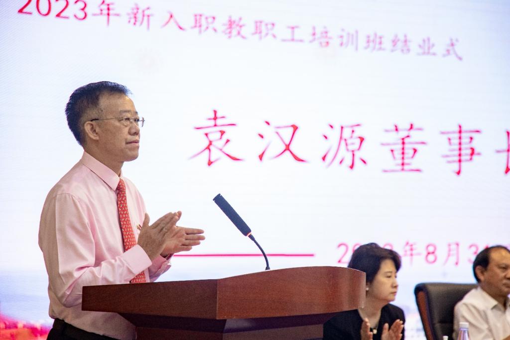 2023年8月31日上午,学校2023年新入职教职工培训班结业式在建德楼203报告厅隆重举行。董事长袁汉源携明德源教育集团助理总裁张琳、常务副总裁王鹏飞、总裁助理李瑞出席结业式,全体校领导、各单位负责人、授课教师及新入职教职工近300人参加,结业式由人力资源处处长白秦川主持。
