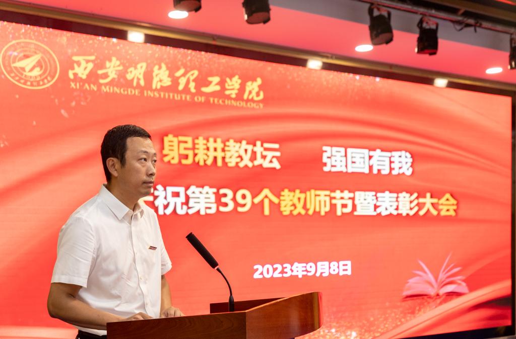 常务副校长王志刚宣读了校级教学名师表彰决定、副校长王斌宁宣读了教师节表彰决定,勉励受表彰的同志珍惜荣誉、戒骄戒躁,发挥示范带头作用,在教育教学各项工作中取得新的更大成绩。号召全校教职工要以受表彰的先进典型为榜样,立足岗位,踔厉奋发,为学校高质量转型发展贡献力量。