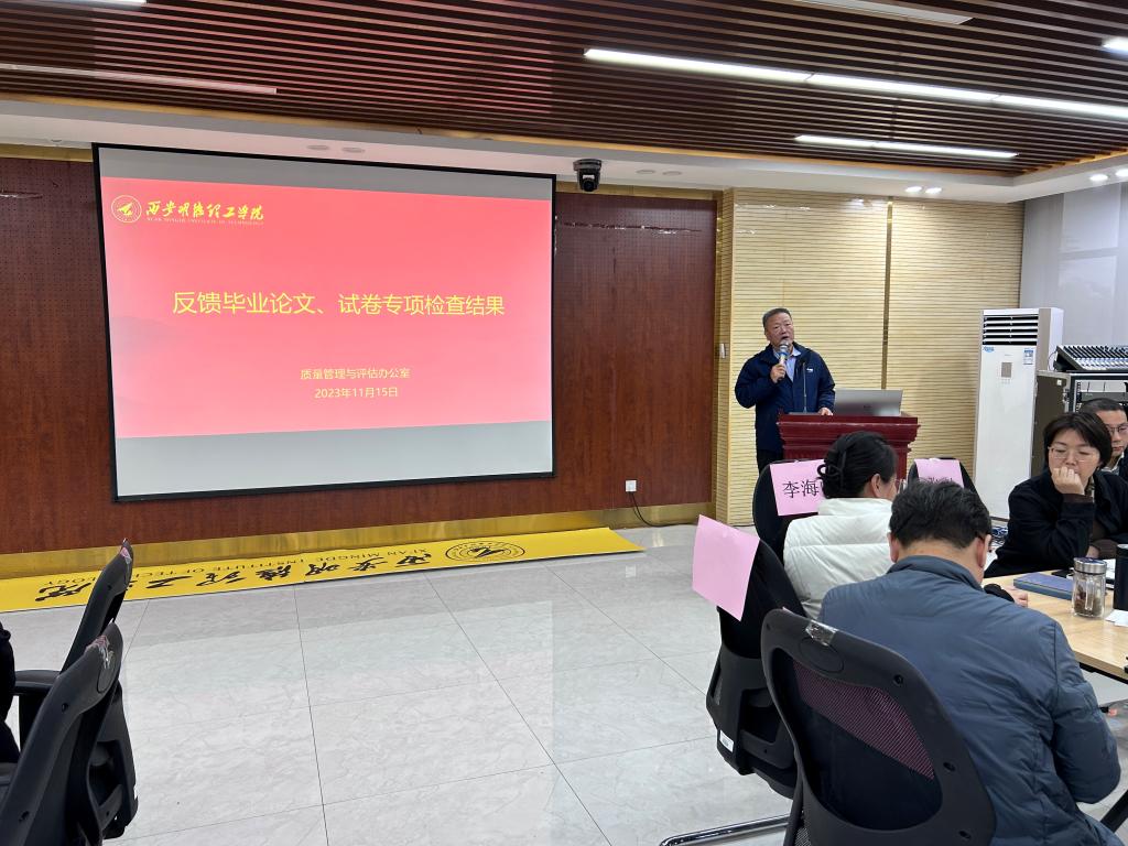 会议第三项,质量管理与评估办公室李海峰教授针对2022-2023学年第二学期的期末试卷和毕业论文专项检查情况进行结果反馈,对检查中存在的问题进行了汇报,并分析了问题出现的原因,提出了针对性的措施和建议,李教授表示,此次专项检查各二级学院均能按照学校相关规定要求落实工作。