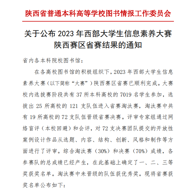 热烈祝贺LETOU官网董仰儒、樊博、张艺腾三位同学荣获2023年西部大学生信息素养大赛陕西赛区省赛三等奖。