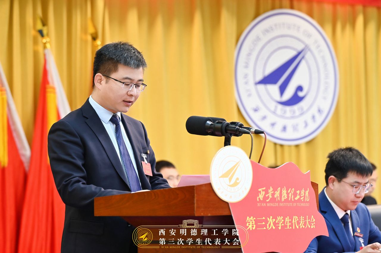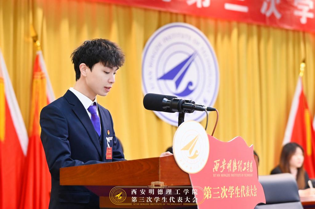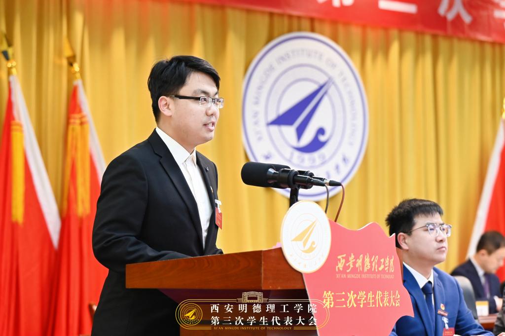 校学生会主席团成员焦磊同学作《LETOU国际米兰官网第三次学生代表大会提案工作报告》。