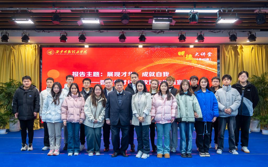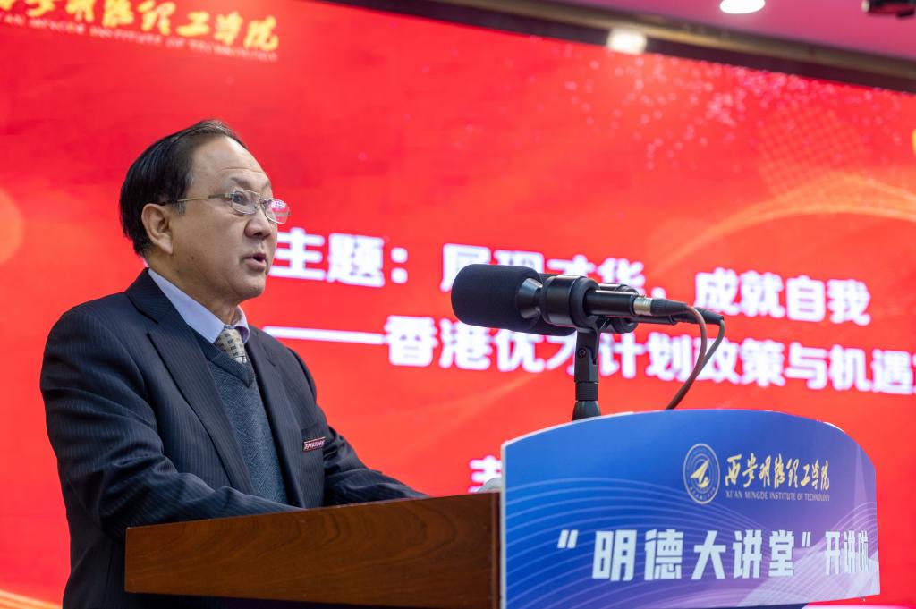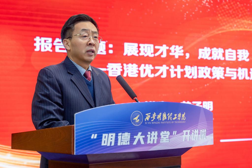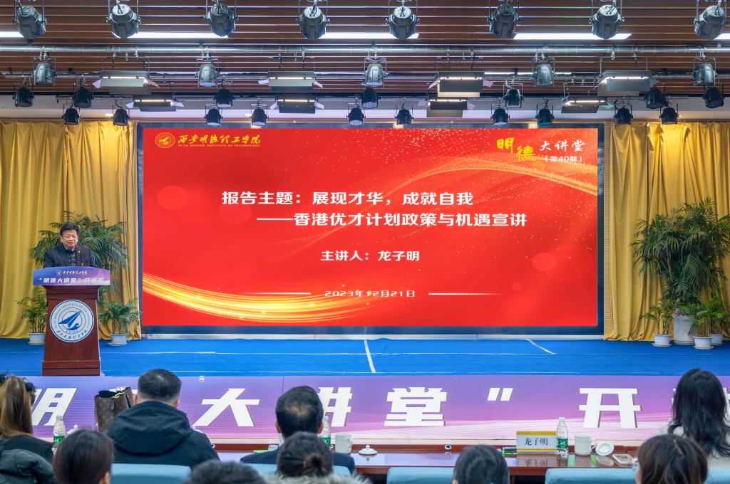12月21日至22日,第十至十三届全国政协委员、香港青年交流促进联会名誉主席龙子明博士一行5人来校作“展现才华,成就自我——香港优才计划政策与机遇”宣讲报告会。学校董事长袁汉源、副董事长张琳、全体校领导出席报告会。校长王志刚、副校长白秦川分别主持报告会并致辞。学校职能部门、教辅单位、二级学院负责人,教师、辅导员、学生代表等参加了报告会。
