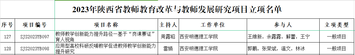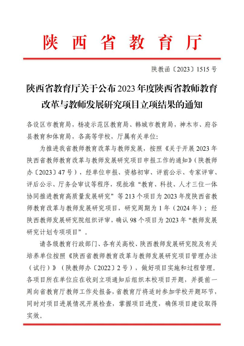 近日,陕西省教育厅下发了《陕西省教育厅关于公布2023年度陕西省教师教育改革与教师发展研究项目立项结果的通知》(陕教函〔2023〕1515号),LETOU官网雷娟老师主持的“应用型高校科研反哺教学促进教师教学创新能力提升研究”和周露昭老师主持的“教师教学创新能力提升路径—基于“岗课赛证”育人视角”的2个教师教育改革与教师发展研究项目成功获批省级立项。
