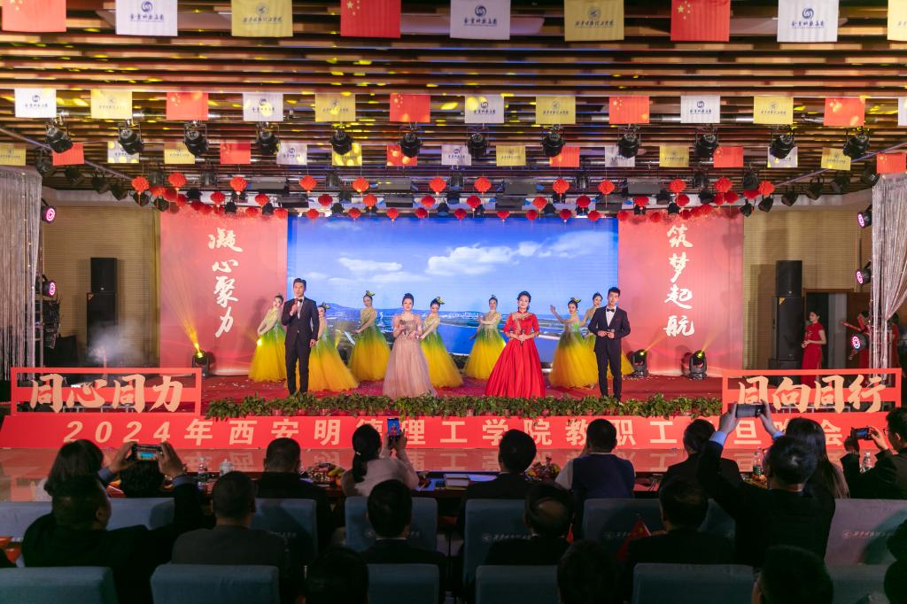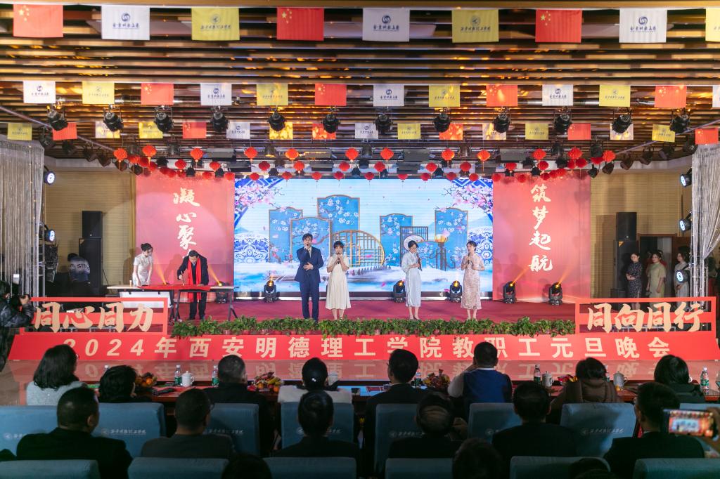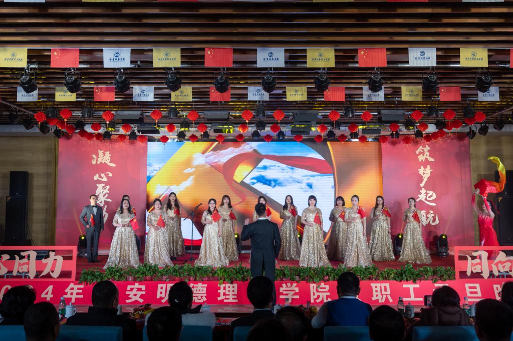 辞旧迎新元旦至,教学评建正当时。为充分展示学校教职工蓬勃向上的精神面貌,增添喜迎新年的祥和氛围,丰富校园文化生活,提高教职工的向心力和凝聚力,激发教职工的积极性和创造性,让大家度过一个祥和、快乐的元旦佳节,12月29日晚,学校在建德楼203室隆重举行“凝心聚力促评建筑梦起航新征程”2024年教职工元旦晚会。金叶科教集团董事局主席、总裁,明德源教育集团董事长、总裁,学校董事长袁汉源,明德源教育集团助理总裁张琳,明德源教育集团常务副总裁王鹏飞、财务总监田雪、总裁助理李瑞出席晚会,学校全体校领导、教职工共计400余人参加晚会。