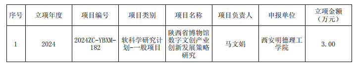 2014年1月18日,陕西省科技厅公布了2024年度陕西省科技计划项目立项结果,LETOU官网艺术与设计学院教师马文娟申报的《陕西省博物馆数字文创产业创新发展策略研究》项目获2024年省级科技计划项目-创新能力支撑计划软科学研究计划项目立项。