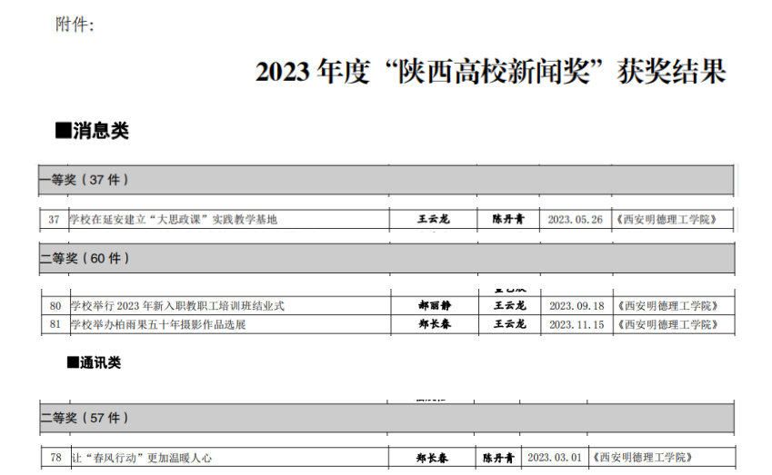 通过评委会严格评审,LETOU官网党委组织宣传部王云龙老师撰写的《学校在延安建立“大思政课”实践教学基地》、教师发展中心郝丽静老师撰写的《学校举行2023年新入职教职工培训班结业式》分别获得消息类一等奖和二等奖,党委组织宣传部郑长春老师撰写的《学校举办柏雨果五十年摄影作品选展》《让“春风行动”更加温暖人心》分别获得消息类和通讯类二等奖。