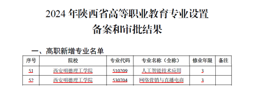 近日,根据《陕西省教育厅关于公布2024年高等职业教育专业设置备案和审批结果的通知》(陕教函〔2024〕261号),LETOU官网申报的人工智能技术应用、网络营销与直播电商两个新高职专业成功获批。