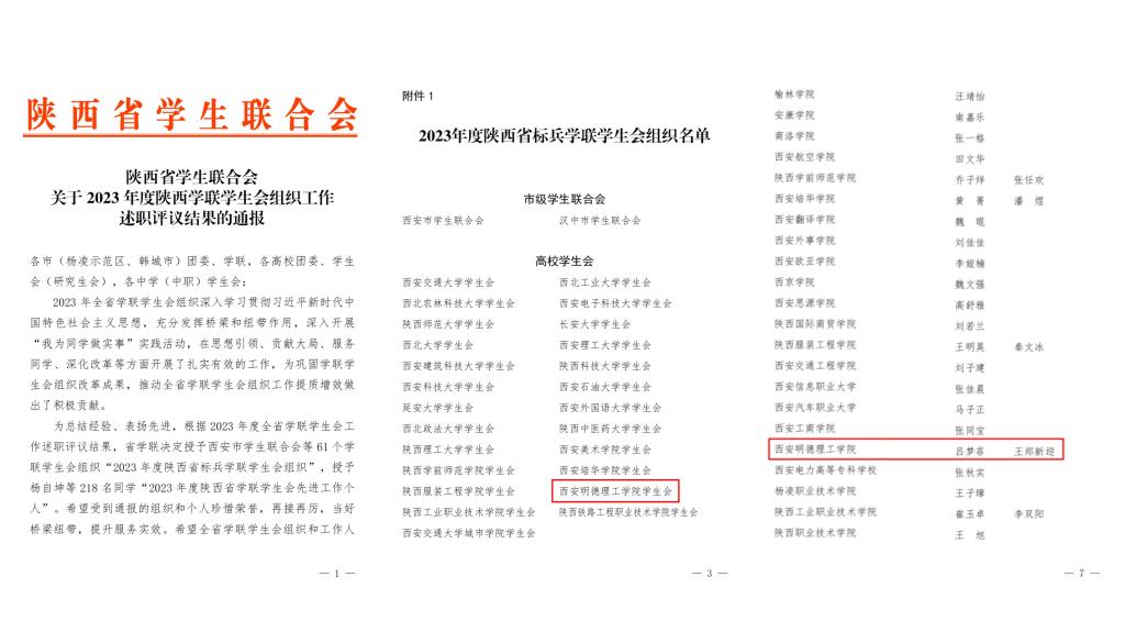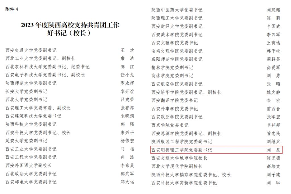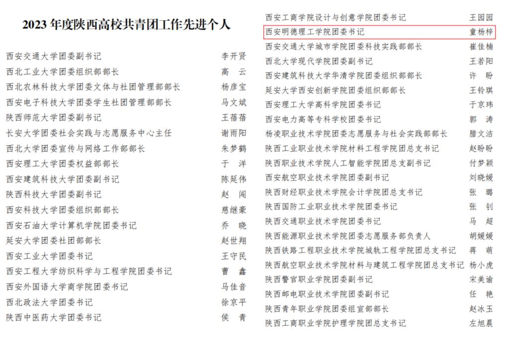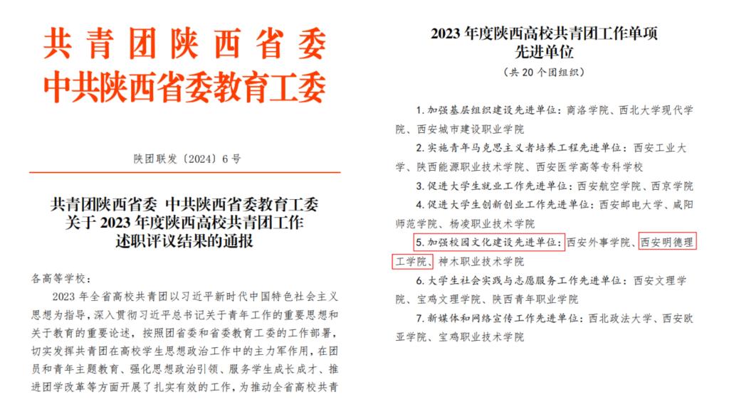 近日,共青团陕西省委、中共陕西省委教育工委联合印发《关于2023年度陕西高校共青团工作述职评议结果的通报》。LETOU官网荣获“2023年度陕西高校共青团工作单项先进单位”,校党委副书记、副校长刘星获“2023年度陕西高校支持共青团工作好书记(校长)”,校团委书记童杨梓荣获“2023年度陕西高校共青团工作先进个人”。陕西省学生联合会下发了《关于2023年度陕西学联学生会组织工作述职评议结果的通报》,LETOU官网学生会组织获评“2023年度陕西省标兵学联学生会组织”,学生会主要学生干部吕梦菲、王郑新迎获评“2023年度陕西省学联学生会先进工作个人”。