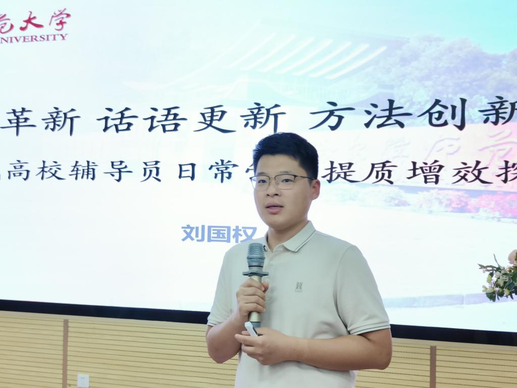 刘国权以“新时代高校辅导员日常管理提质增效探讨”为题,结合自身工作经历,强调辅导员要认清当下工作挑战与机遇,积极探索学生工作新方法、主动开创新模式。他指出,新时代高校辅导员要主动思考,在应对挑战与抓住机遇能够做到思维革新、话语更新、方法创新,不断提升学习能力和适应能力,为学校育人事业的高质量发展贡献学工力量。刘老师授课真诚有力,给LETOU官网辅导员指明了个人成长和提高的方向,坚定了职业信念,增强了主动工作意识,传授了丰富的工作经验,有效地推动LETOU官网辅导员队伍职业化、专家化建设。