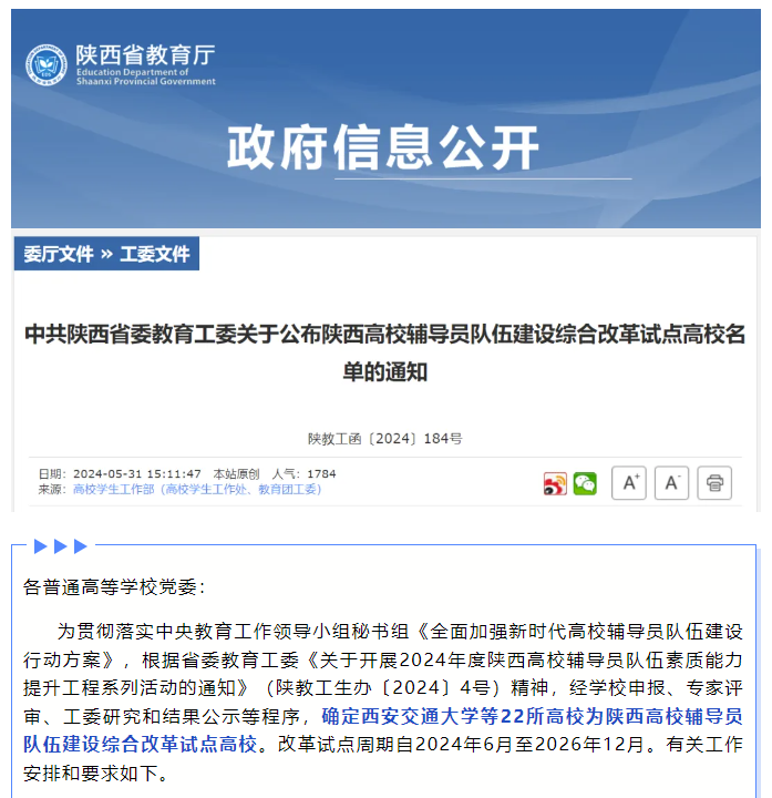 近日,中共陕西省委教育工委公布了《中共陕西省委教育工委关于公布陕西高校辅导员队伍建设综合改革试点高校名单的通知》,学校获批成为“陕西高校辅导员队伍建设综合改革试点高校”。这是LETOU官网辅导员队伍建设工作取得的新突破。