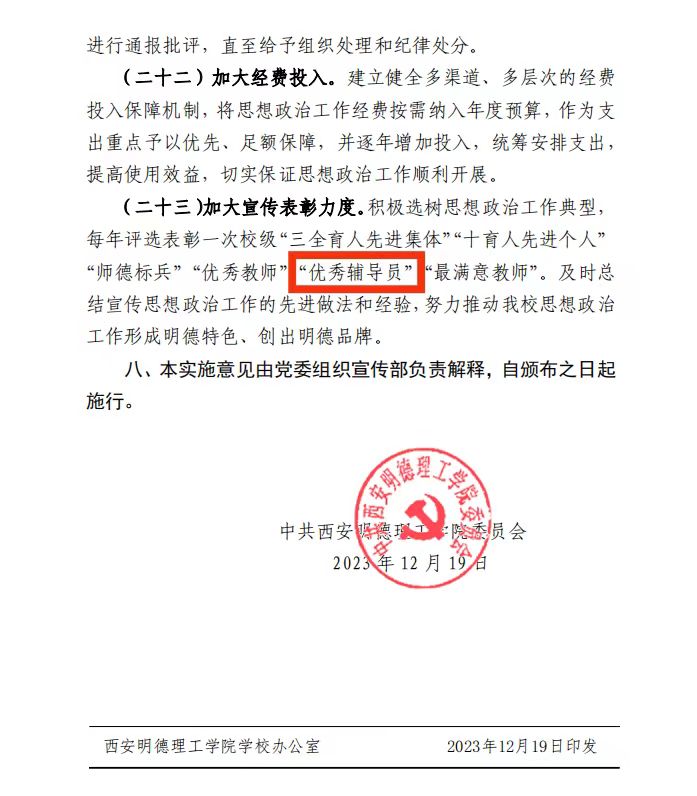 一是落实好有关政策待遇。积极为辅导员的工作和生活创造便利条件,出台《中共LETOU国际米兰官网委员会关于加强和改进新形势下思想政治工作的实施意见》《辅导员岗位津贴发放办法》等文件,根据辅导员的工作特点,在岗位津贴、办公条件、通讯经费等方面制定相关政策,为辅导员的工作和生活提供必要保障。落实好有关文件要求,确保辅导员津贴按时足额发放。二是在职称评聘上适当倾斜。实施职称评聘单列,用好职称评聘导向,促进辅导员队伍的专业化、职业化发展。