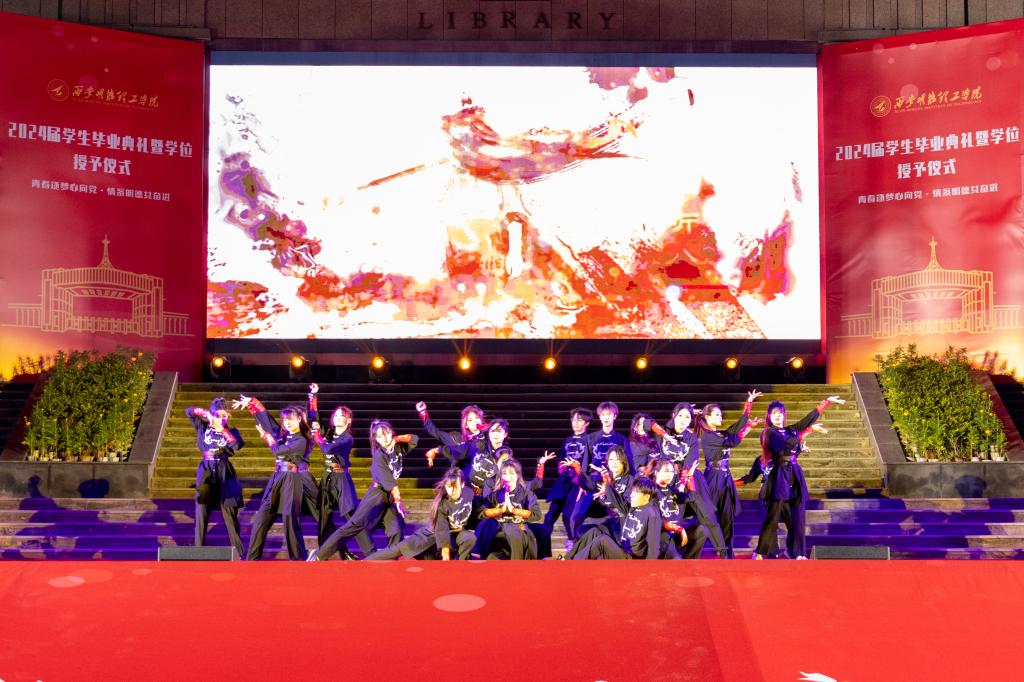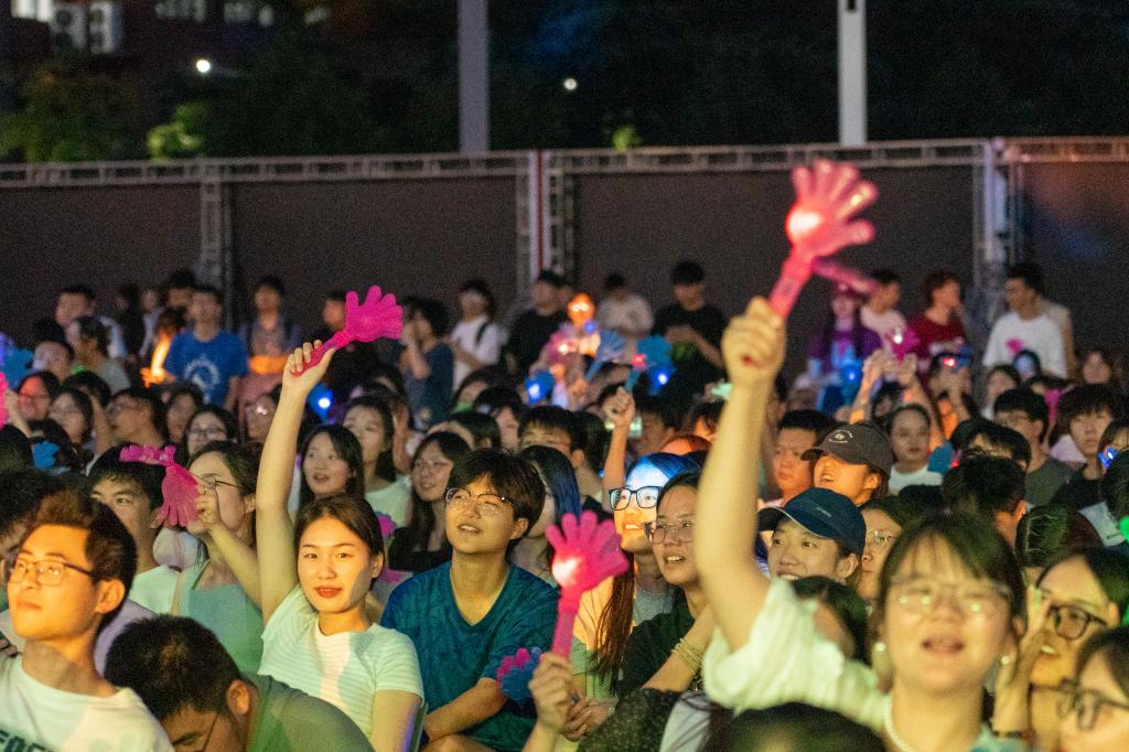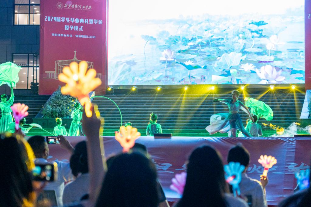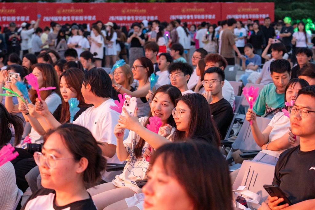 晚会下半场来自学校毕业生、大学生艺术团、学生社团的“宝藏”校内歌手轮番惊喜献唱无边界毕业限定歌会,生动演绎了《凤凰花开的路口》《你曾是少年》《我的未来不是梦》等音乐作品,唱出成长中的跌跌拌拌与对梦想执着的追求,寄语毕业生们勇敢逐梦,踏浪前行,一首欢快的《再见》许下毕业再见、不说再见的约定。歌声直抵人心,上扬的音符包含着对生活的热爱和青春的赞美,引发现场观众的共鸣,大家挥舞着手中的闪光手拍掌,跟随着音乐的律动尽情舞动,灯光、音乐、掌声、喝彩声相互交映,点亮夜空。