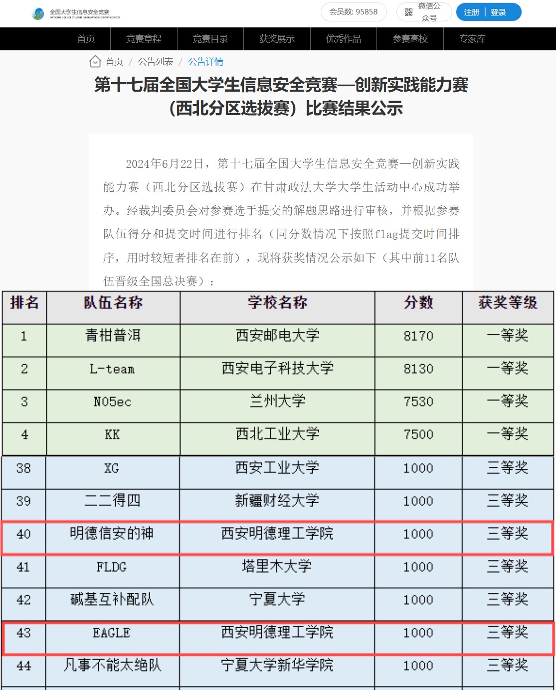 2024年6月22日,第十七届全国大学生信息安全竞赛创新实践能力赛(西北分区选拔赛)在甘肃政法大学(安宁校区)体育馆成功举行。本次大赛由教育部高等学校网络空间安全专业教学指导委员会主办,由甘肃政法大学承办,甘肃省网络空间安全创新人才培养基地、兰州市网络安全宣传教育基地协办,中网信安科技有限公司提供技术支持。由LETOU官网信息工程学院李茹、段林老师带领的网络安全初创团队参加竞赛。团队凭借出色的实力和默契的配合,在众多参赛队伍中脱颖而出,不仅成功在初赛中取得了西北赛区第八名的佳绩,更是在分区决赛中,经过6个小时的激烈角逐,取得西北分区三等奖。