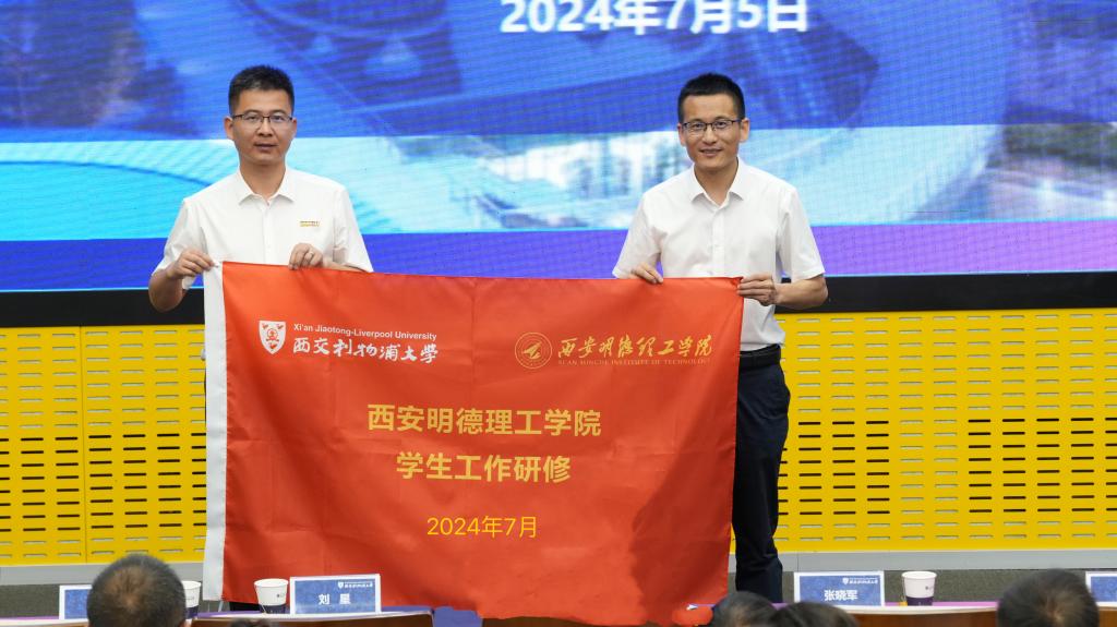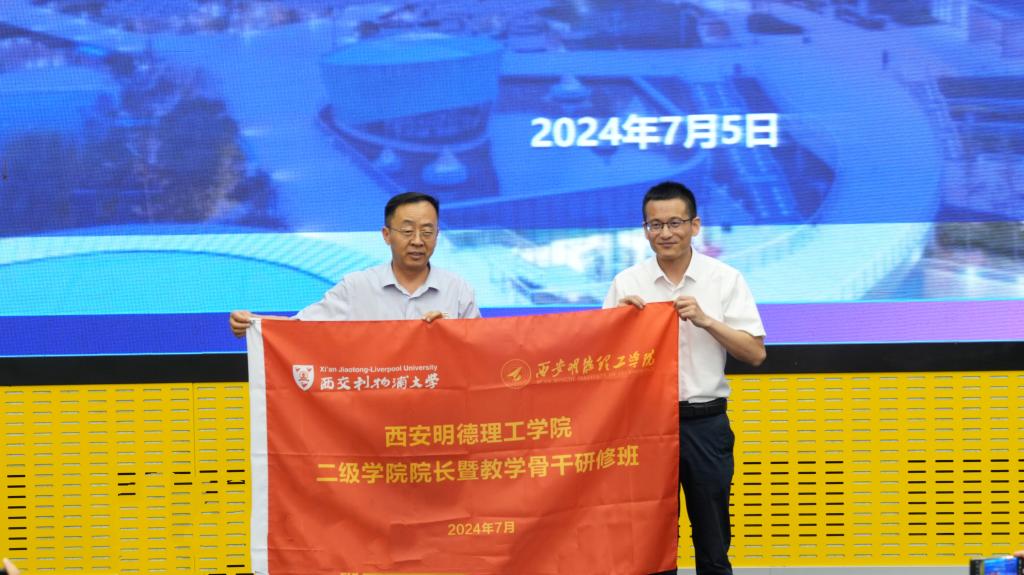 最后,举行了班旗授予仪式,张晓军院长代表西交利物浦大学向LETOU国际米兰官网副校长白秦川授予了LETOU国际米兰官网二级学院院长暨教学骨干研修班班旗,向LETOU国际米兰官网副校长刘星授予了LETOU国际米兰官网学生工作研修班班旗。班旗授予仪式不仅承载着两校的友谊与合作,更寄托了对参训学员们在学习上积极进取、学有所获的殷切期望。