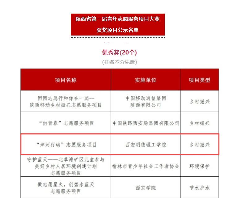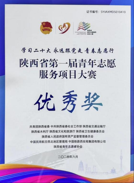 2024年7月9日,“陕西省青年志愿者协会五届二次会员代表大会暨陕西青年志愿者助力文旅和赛会经济志愿服务行动启动仪式”在西安理工大学曲江校区举行,会上表彰了“陕西省第一届青年志愿服务项目大赛”获奖项目。学校“沣河行动”志愿服务项目荣获陕西省第一届青年志愿服务项目大赛优秀奖。
