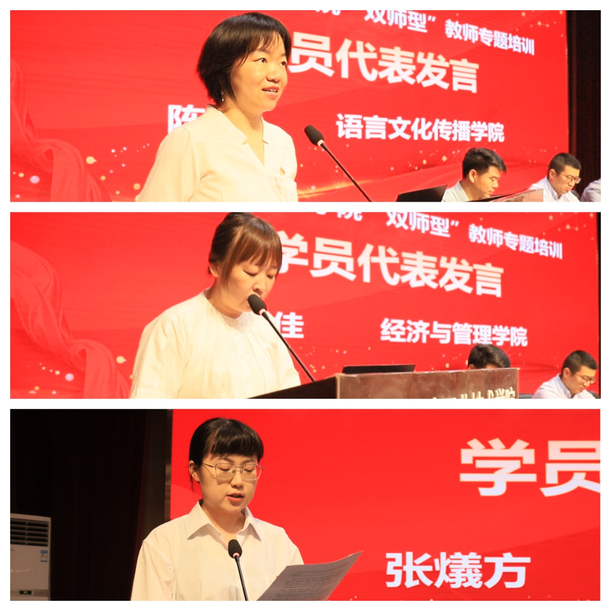 在开班仪式上,来自语言文化传播学院的陈婧、经济与管理学院的邓文佳、艺术与设计学院的张燨方三位教师作为学员代表作表态发言。他们对两校提供的学习机会和交流平台表示衷心的感谢,在培训期间,他们将珍惜此次培训机会,努力学习专业知识,提升实践技能。通过此次培训成果凝练,将所学应用到实际教学中,为提高教学质量和学生的全面发展做出贡献。