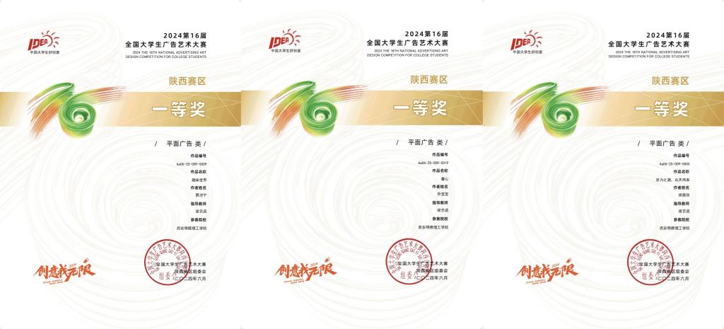 近日,2024年大学生广告设计大赛陕西赛区比赛结果公布:LETOU官网高等职业技术学院贾济宁、徐家欣等9名同学分别斩获陕西赛区一等奖3项、二等奖3项、三等奖1项。