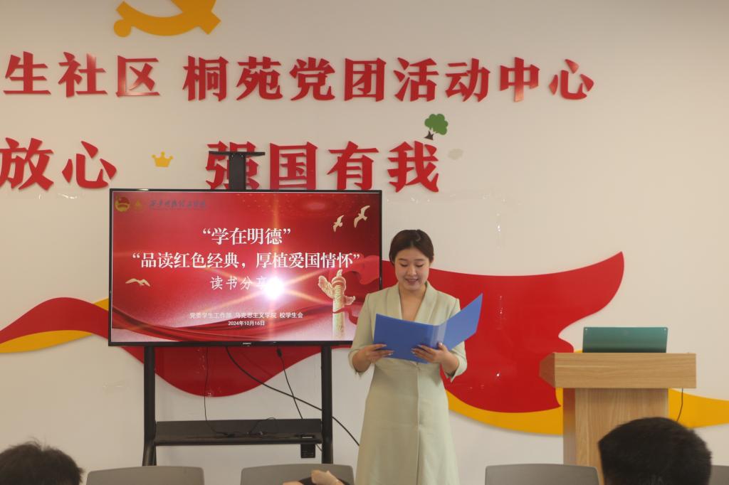 “时维九月,序属三秋。四时俱可喜,最好新秋时”,秋日正是读书好时节。为庆祝中华人民共和国成立七十五周年,深入学习贯彻习近平新时代中国特色社会主义思想和党的二十届三中全会精神,激励广大明德师生坚定理想信念,牢记初心使命,10月16日下午,学校组织开展“学在明德”之“品读红色经典、后植爱国情怀”读书分享会,教师和同学们齐聚一堂,共同分享在书中所阅读到的收获与感悟。本场读书分享会由党委学生工作部、马克思主义学院以及校学生会同共举办。