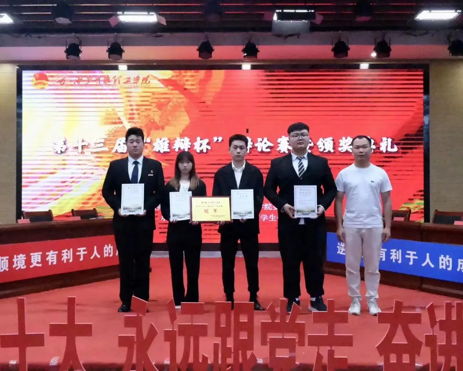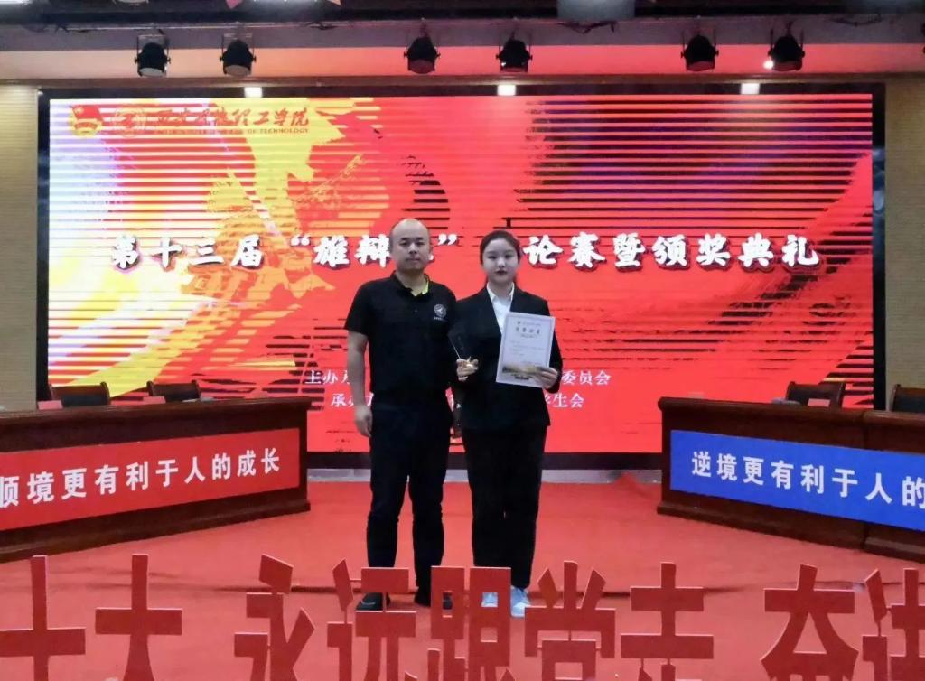 最终,智能制造与控制技术学院获得冠军,语言文化传播学院获得亚军,高等职业技术学院获得季军,反方三辩郭可盈同学被评为“最佳辩手”,童杨梓老师、刘雄老师、杨峰老师、曾凯老师为获奖辩手及队伍颁奖。