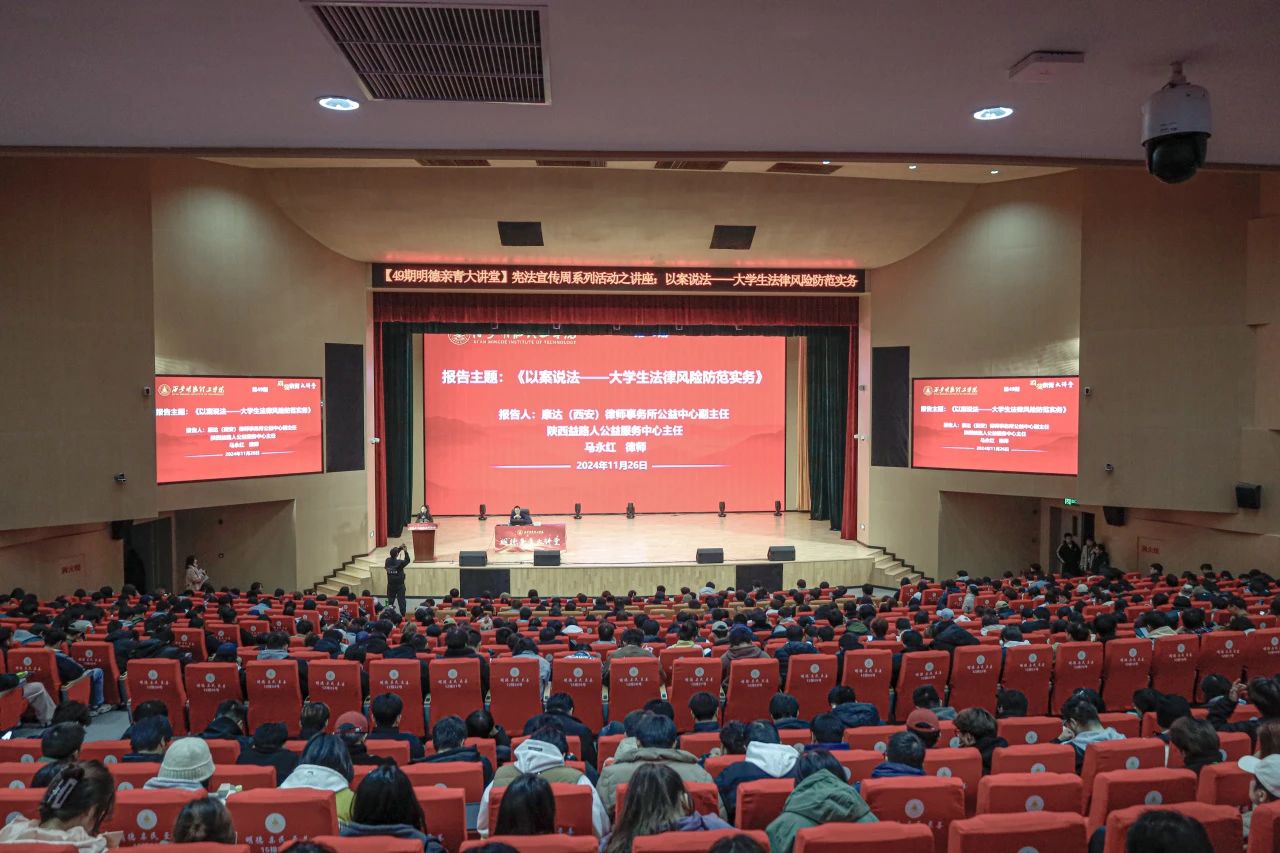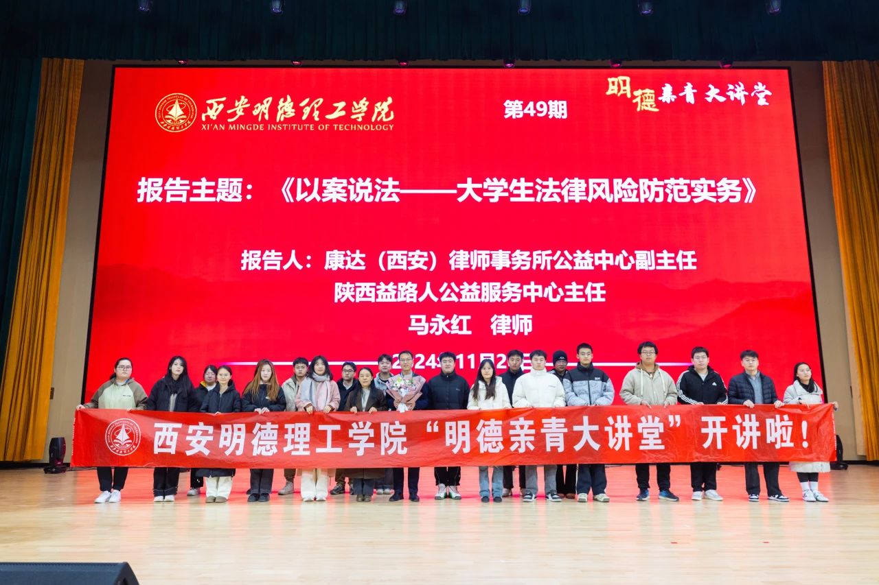 2024年11月27日晚,四季廊桥报告厅座无虚席,第49期明德“亲青大讲堂”邀请了陕西益路人公益服务中心主任、康达(西安)律师事务所公益中心副主任马永红律师作题为“以案说法:大学生法律风险防范实务”的精彩报告。报告由马克思主义学院德育教研室主任樊静教授主持,近1200名师生参加。本期明德“亲青大讲堂”由校团委和马克思主义学院联合举办。