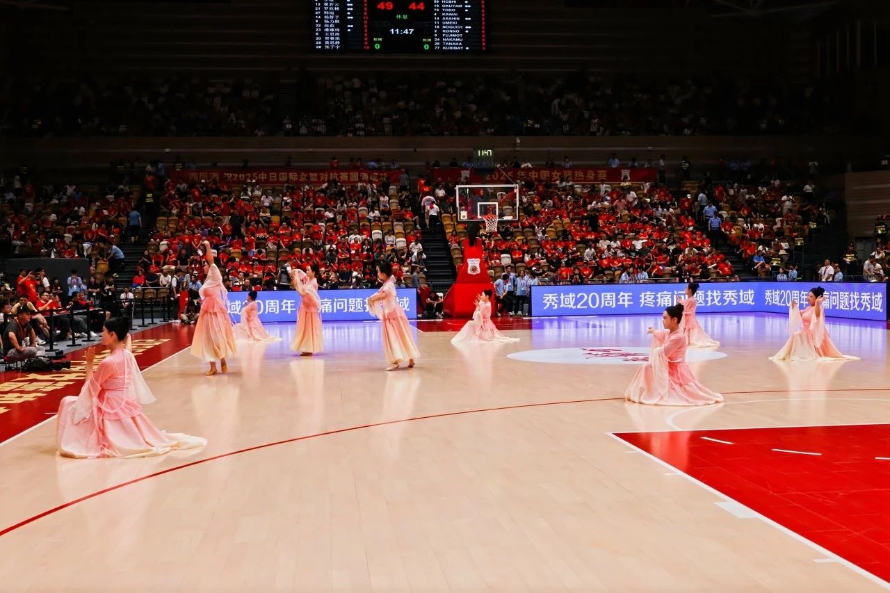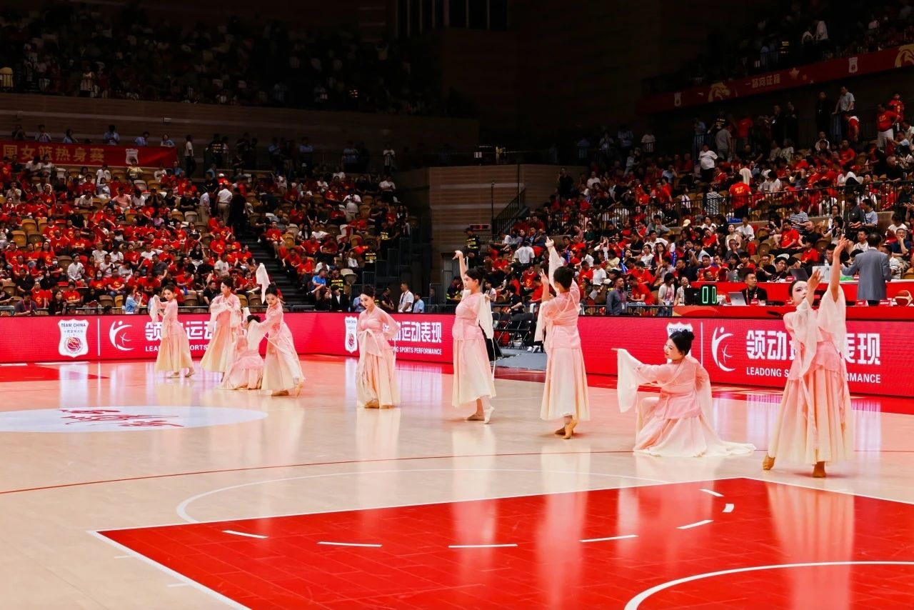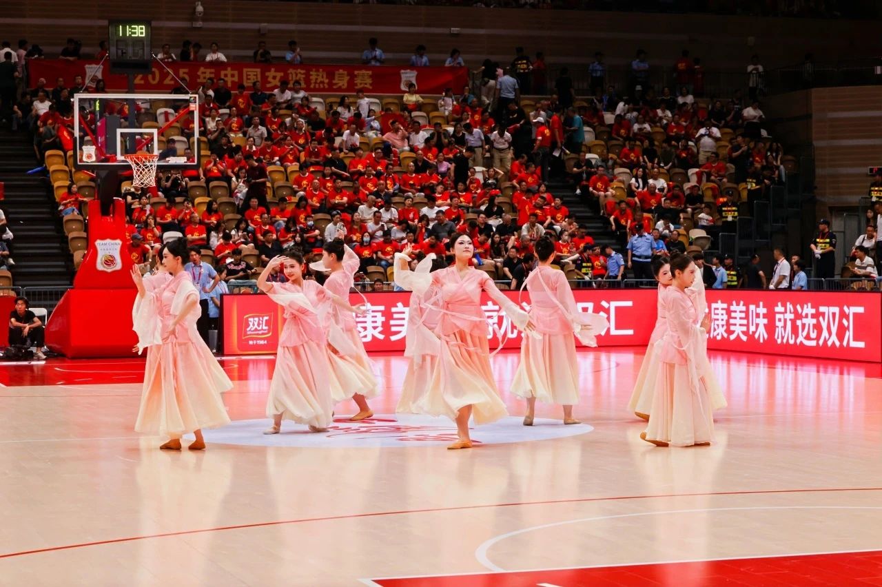 作为国际篮联认证的A级赛事,本场比赛吸引了近万名观众到场观赛。中场休息,中国女篮凭借默契配合暂时领先,但场边的紧张感仍在蔓延。此时,9名身着淡粉与月白相间舞衣的姑娘,从舞台两侧轻盈入场。