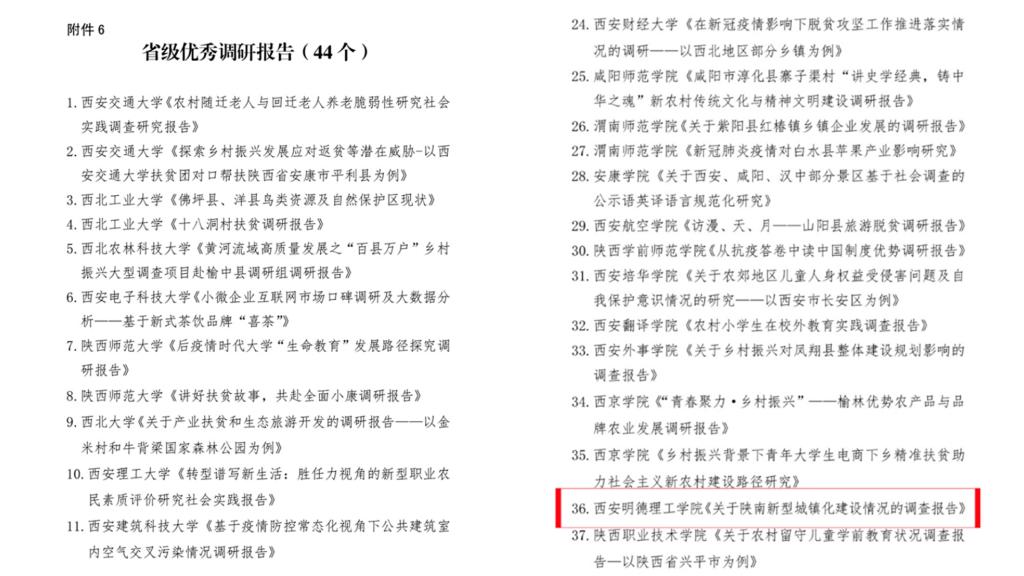 学院被授予2020年“三下乡”活动省级优秀组织单位称号;“曙光青春行”禁毒防艾知识宣讲团、“七彩青春”科技助农社会实践服务团被授予省级优秀团队荣誉称号;谢敬仙、赵雨玉两位同学被评为省级优秀个人荣誉称号;《关于陕南新型城镇化建设情况的调查报告》荣获省级优秀调研报告荣誉称号。
