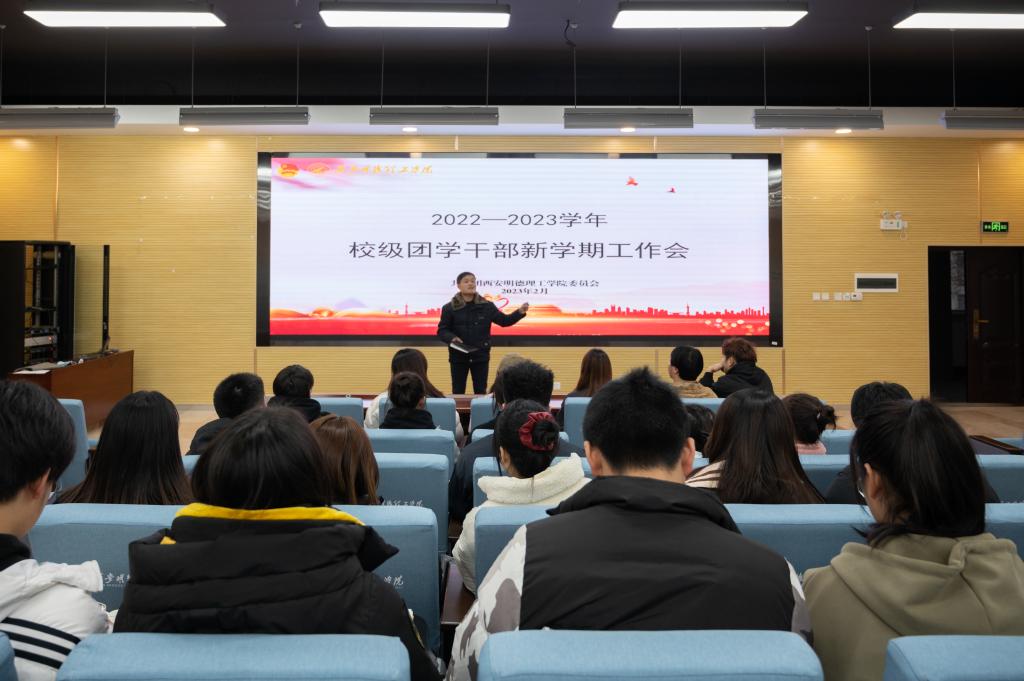 为加强团学干部队伍建设,推动新学期共青团工作顺利开展。2月20日晚,校团委在建德楼202教室召开新学期团学干部工作会。会议由校团委副书记乔建老师主持,相关负责老师及校级团学组织负责人参加了会议。