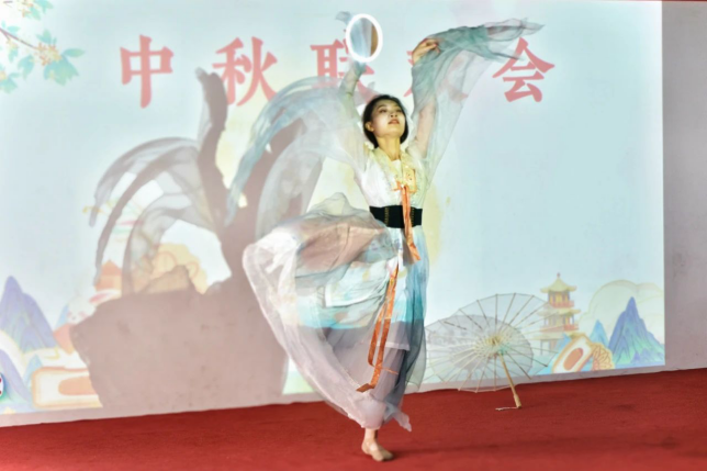花团锦簇拥金秋,万里河山迎国庆。9月29日,校团委、后勤产业集团在沣河苑餐厅二楼联合举办了“迎中秋·庆双节”联欢活动。1300余名留校师生参加了活动。活动中,大学生艺术团的同学们表演了舞蹈《广寒谣》、器乐演奏《但愿人长久》、歌曲《看月亮爬上来》《裹着心的光》《我爱你,中国》等。同学们品尝着学校精心准备的月饼、水果、饮料等。抽奖环节让大家感受到了满满的温馨。在“天涯共此时”的温馨氛围中,明德师生共寄团圆之思,共念家国深情。