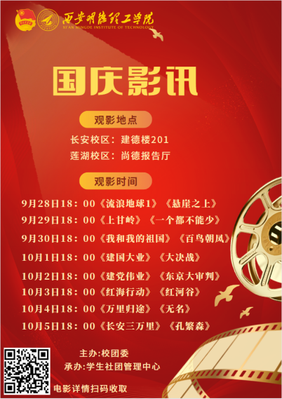 追寻红色光影,感悟红色情怀。9月28日至10月5日,学校南北校区开展“喜迎国庆”主题观影活动。本次活动先后播放了电影《我和我的祖国》、《建国大业》、《红海行动》等16部红色影片。在电影播放过程中,同学们屏息凝神,一幕幕镜头令人深受震撼。观影活动结束后,同学们纷纷表示,我们要时刻铭记历史,铭记那些为国捐躯的英雄,铭记祖国因何山河无恙、今天因何国泰民安;更要珍惜老一辈革命先烈用生命换来的和平与幸福,将革命先烈不畏艰难、勇于奉献的精神落到实处。