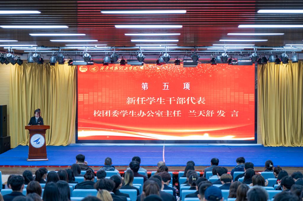 大会在庄严的团歌声拉开帷幕。会议伊始,各校级学生组织指导教师为上一届学生干部颁发聘书及纪念品为他们的付出和奉献表示感谢。接着,2022-2023学年校级学生干部代表陈瑾瑜发言,她分享自己作为学生干部的宝贵经验。刘雄宣读新任校级学生组织学生干部任命名单决定,新任学生干部代表兰天舒同学发言,学生干部代表王泽豪带领全体2023-2024学年校级学生干部就职宣誓:“表态将严于律己,以身作则,以更加强烈的使命感和责任感为学校的蓬勃发展贡献力量”。