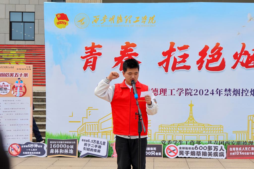 学校禁烟控烟学生倡导者、青年志愿者服务团负责人王泽豪带领全体师生集体宣读《禁烟控烟承诺书》。所有人郑重承诺不在宿舍、食堂、教室、实训楼、图书馆、场、校道等校公众场所吸烟,自觉远离烟草,倡导健康生活。