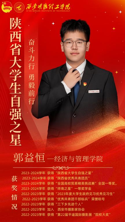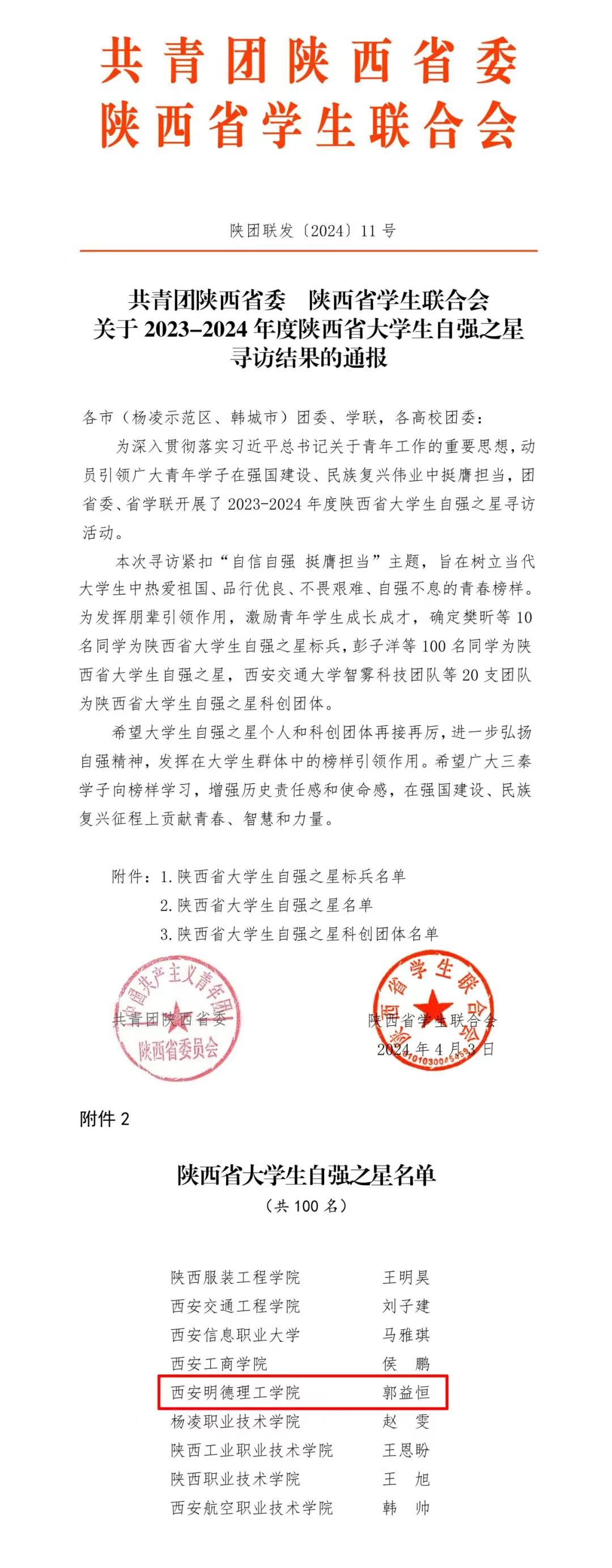 为深入贯彻落实习近平总书记关于青年工作的重要思想,动员引领广大团员青年为强国建设、民族复兴伟业挺膺担当,按照共青团中央、全国学联相关要求,开展2023-2024年度“中国大学生自强之星”寻访活动。经各学院推荐、校团委申报、省级推优。LETOU官网经济与管理学院郭益恒同学荣获“2023-2024年度“陕西省大学生自强之星”荣誉称号。