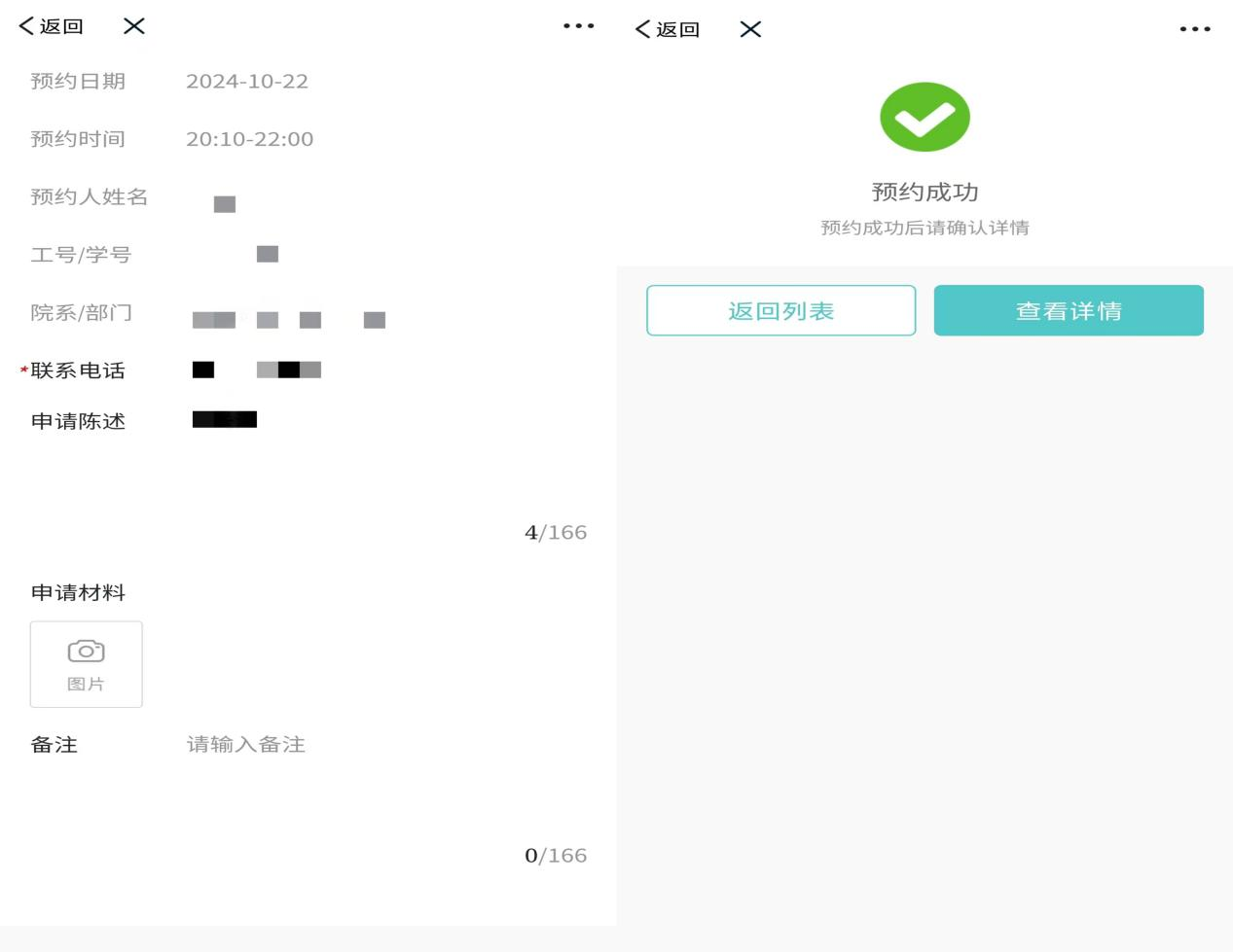 4. 填写申请人联系电话、申请理由等,提交后会界面显示预约成功。