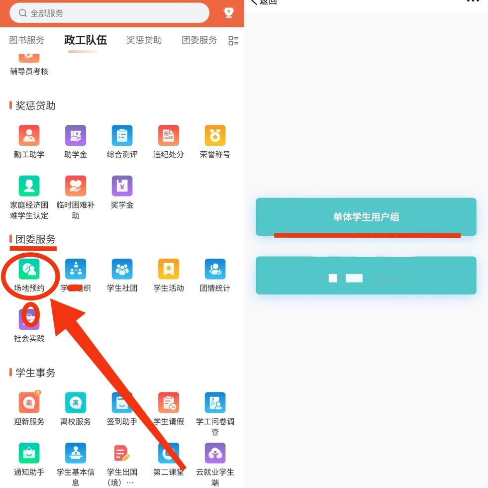 2. 找到团委服务中的场地预约,选择单体学生用户。