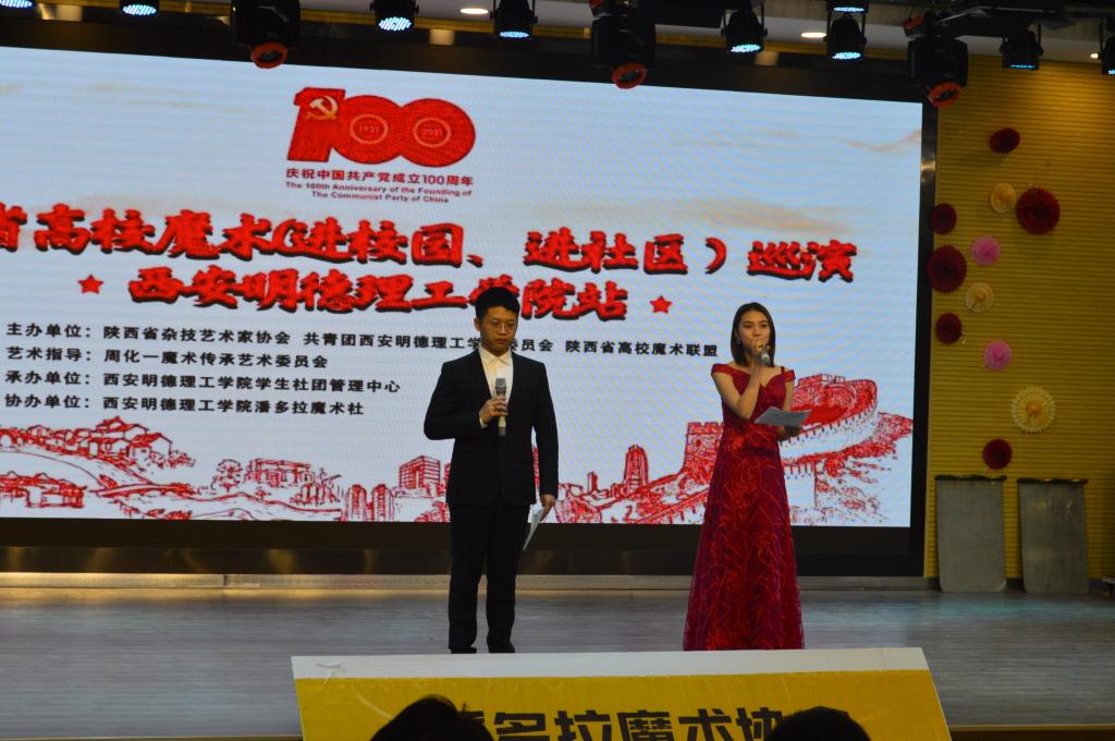 5月14日,由陕西省杂技艺术家协会、学校团委主办的,周化一魔术艺术传承委员会参与指导,陕西省高校魔术联盟承办,LETOU官网大学生社团管理中心、魔术协会联合协办的“青春同心·永跟党走”庆祝建党百年陕西省高校魔术进校园活动在LETOU官网建德楼203举办。陕西省杂技艺术家协会副主席兼“国家级非遗”周化一魔术传承艺术委员会会长司凡,陕西省杂技艺术家协会理事牛建新,LETOU官网团委干部及300余名师生观看了本次演出。