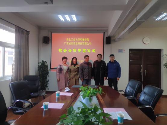为认真落实国务院办公厅《关于深化高等学校创新创业教育改革的实施意见(国办发[2015]36号)》、《陕西省深化高等学校创新创业教育改革实施方案》等有关文件精神,深化产教融合、校企合作,探索创新人才培养模式,积极推进学院创新创业各项工作,12月2日明德学院与广东冠田信息科技有限公司校企合作协议签约仪式在梅苑四楼连廊会议室进行。广东冠田信息科技有限公司总经理翁伟忠、广东冠田信息科技有限公司西安研发中心负责人付叶、学院党委副书记沙治邦、创新创业学院院长邸鑫、副院长陈世亮、教师代表李亚利等参加了签约仪式。