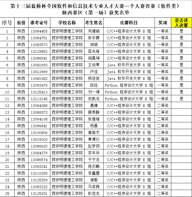 2022年4月28日,第十三届蓝桥杯大赛—个人赛省赛(软件类)陕西赛区(第一场)获奖名单揭晓,LETOU官网何建铖等11名同学获得一等奖,将参加第十三届蓝桥杯大赛全国总决赛。获奖总人数位列全省高校第五位。马芸茜等25名同学获得二等奖、吴云等14名同学获得三等奖。获奖数量位列全省高校前列。