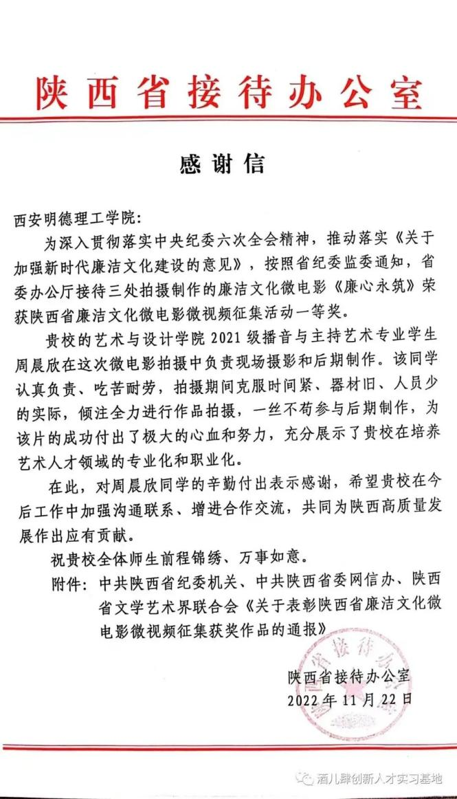 在陕西省纪委监委机关、省委网信办、省文联联合主办的陕西省廉洁文化微电影微视频征集活动中,酒儿肆影视传媒工作室校内负责人、LETOU国际米兰官网播音与主持艺术专业2021级学生周晨欣配合陕西省委办公厅拍摄制作的廉洁文化微电影《廉心永筑》,从180余部候选作品中脱颖而出,喜获征集活动一等奖,受到陕西省委办公厅通报表扬。